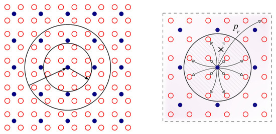 Schemes representing the network topologies used in the present study. (Left) The standard network topology used for the generation of brain waves in a E/I balanced cortical neuron population module as in Refs. [12,16]. The neuron coupling scheme represented in the panel is such that the small circle contains 12 E neurons (open red circles) that receive synaptic inputs from the inhibitory neuron (filled blue circle) in its center. On the other hand, the large circle contains 32 E neurons that excite the inhibitory neuron in its center. (Right) To see the robustness of the reported results in our study we also use a more complex small-world topology rewiring the given E-I and I-E connections in the network with some rewiring probability (see Supplementary Materials for the associated study). In the illustrated example in the figure, one of the inhibitory connections of an I neuron to a given E neuron within its influence circle (as explained in the left panel) is exchanged with probability by a new inhibitory connection into other excitatory neuron in a random position in the network.