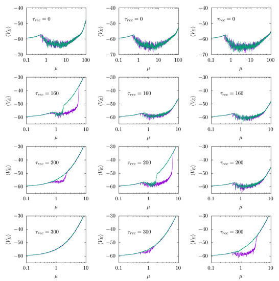 Using this clear-cut realistic model, we numerically analyzed how synaptic STD affects eventually emergent waves by carefully monitoring the network dynamics for adiabatically increasing values of the noise parameter µ. Figure 2 depicts the resulting average membrane potential of the E population versus µ, which clearly illustrates the mentioned sharp transitions, i.e., in the absence of STD (top panel in each column), the well-defined nature of waves does not vary with the external noise amplitude within µ∈ (0.5, 100), as already reported in [16]. This regime corresponds to the simplest and most familiar brain waves. However, when STD is on—specifically, when the parameter is large enough so that synaptic efficacies vary noticeably with system activity—an ‘explosive’ transition may show up as µ increases. This occurs at lower the lower the maximal excitatory postsynaptic amplitude is. It is said ‘explosive’ in the sense that the transition shows hysteresis, from well-defined synchronized behavior to a state of high excitation and low coherence, as we vary µ adiabatically forwards (purple line) and backwards (green line). One may also name this a first-order phase transition by simple analogy with thermodynamics, though with the warning that the present setting is a nonequilibrium one [40]. These findings, i.e., the explosive transition and the emergence of hysteresis, are robust to size increases (see additional analysis in Supplementary Materials), so it is, therefore, likely to occur even for populations with a considerable number of neurons.