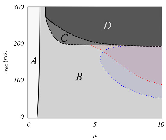 Diagram illustrating the different dynamical phases in our system. For low noise (region A), random sporadic excitatory firing events emerge, which are unable to depolarize the I neurons. Region B shows well-defined rhythms ranging from to bands, while a higher depression induces a cease of the inhibitory activity and a consequent absence of synchronicity and coherence in region D. Metastability, as illustrated in Figure 2, characterizes the region C. Red and blue colored areas in B indicate emerging waves with high values of the firing rates (>100 Hz) for E and I neurons, respectively. Dashed lines illustrate first-order phase transitions, while continuous lines denote second-order transitions.