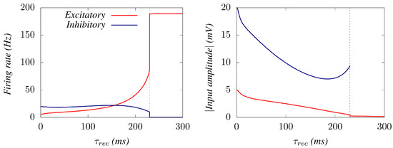 where denotes the Heaviside step function. The form of these inputs generated by E and I neurons are chosen so that the response produced on the postsynaptic neuron membrane matches data; see, for instance, [16]. Thus, for simplicity, we model the excitatory synaptic input by a square pulse of width and maximal amplitude , as described by Equation (3), and the inhibitory input with a maximum amplitude followed by an exponential decay with time constant , as in Equation (3). In addition, to account for synaptic strength variations that depend on presynaptic history, we multiply these input functions by a factor , thus ensuring that the amplitude of the synaptic input is proportional to the amount of neurotransmitters released right after a presynaptic spike, which is an activity dependent factor through dynamics in Equation (2). Please note that there is no synaptic variability present when occurring for Furthermore, to prevent the membrane potential in (1) from reaching physiologically unrealistic levels, we impose upper and lower limits of mV and mV, respectively, around the resting membrane potential, as said. This is achieved by multiplying the different excitatory and inhibitory inputs by the terms and , respectively.