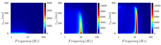 Emergence of “ rhythms” (around 10 Hz) in the model for noise levels µ = 0.6, 0.8 and 1.0, respectively, from left to right. Although the power of the main frequency peak of the waves decays as STD increases, the case of µ = 1.0 clearly illustrates how these waves details are not dramatically affected by synaptic depression for this noise level and the band regime remains until , where the waves disappear (note that this transition becomes explosive for as shown in Figure 6).