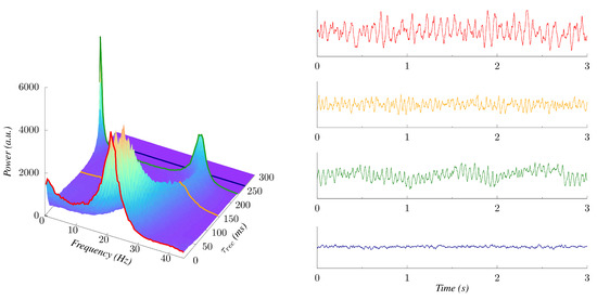 (Left) Power spectra of the system response as a function of the recovery time for . (Right) time series of the emergent oscillations for particular levels of synaptic depression, namely = 0, 145, 230 and 265 ms, respectively, from top to bottom. The associated power spectra for each of these series are highlighted (with the same color) in the surface plot of the left panel.