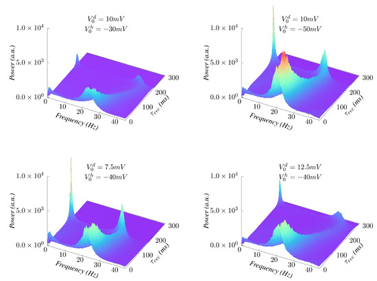 In absence of STD, the present model has previously been successful to accurately reproduce relevant features of different type of brain waves in actual EEG recordings as, for instance, the power spectrum of -waves in thalamus and their steady-state voltage distribution (see Refs. [12,16]). Moreover, we already reported in [16] a unifying framework for the generation of different brain rhythms just by tuning the level of uncorrelated excitatory inputs that a cortical neural population received from other brain areas, reproducing oscillatory behavior in the , , and ultrafast bands, as observed in actual EEGs.