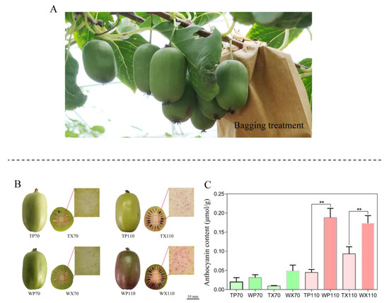 Sample treatment and preparation for RNA-seq. (A) Fruits were bagged using two-layer light-impermeable paper bags at one month after full bloom. (B) Peel and core were collected from bagged and unbagged fruit making a total of eight typed samples used for RNA-seq. (C) The anthocyanin content of these eight typed samples. Note: S1—fruit stage at 70 days after full bloom, S2—fruit stage at 110 days after full bloom, TP70—peel from bagged fruit at S1, TX70—core from bagged fruit at S1, TP110—peel from bagged fruit at S2, TX110—core from bagged fruit at S2, WP70—peel from unbagged fruit at S1, WX70—core from unbagged fruit at S1, WP110—peel from unbagged fruit at S2, WX110—core from unbagged fruit at S2. Data were analyzed with Student’s t-test (** p < 0.01).