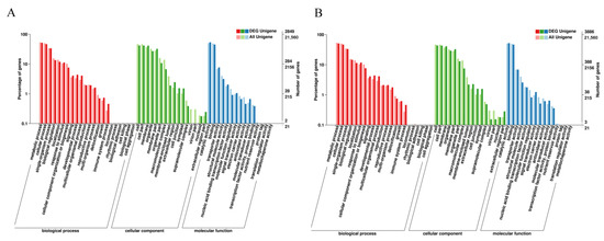 GO classification of DEGs from WP110 vs. TP110 and WX110 vs. TX110. (A) GO classification of DEG unigenes from WP110 vs. TP110. (B) GO classification of DEG unigenes from WX110 vs. TX110. The x-axis in (A,B) represents GO level-two terms belonging to three GO categories including biological process, cellular component, and molecular function. The y-axis in (A,B) represents the percentage and number of unigenes.