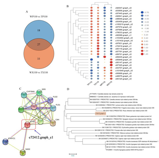 The possible MYB-related genes involved in light-inducible fruit coloration. (A) Venn diagram of MYB-typed DEGs between WP110 vs. TP110 and WX110 vs. TX110. (B) The transcription level of 27 MYB-typed DEGs. (C) The analysis of functional protein association networks in Arabidopsis for MYB4 as the closest ortholog available of c72412.graph_c1. (D) Phylogeny analysis of c72412.graph c1 and its top 20 homologous genes in NCBI blast. The way of phylogenetic tree construction is Construct/Test Neighbor-Joining Tree in MEGA 6.0 software (Version 6.0, Mega Limited, Auckland, New Zealand). The orange shadow mutates the transcript c72412.graph c1. The setting bar for genetic distance is 0.02.