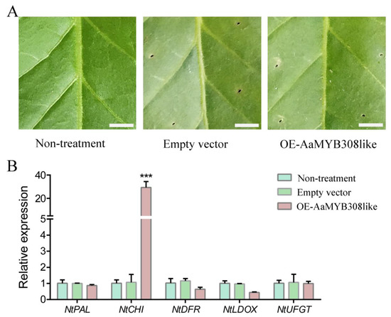 In order to further investigate the specific role of AaMYB308like in anthocyanin regulation, transient overexpression of AaMYB308like was carried out in N. tabacum leaves by Agrobacterium-mediated transformation. Phenotypic observation of tobacco after infiltration showed that the leaves of transiently over-expressed AaMYB308like showed no obvious changes compared with the control with the empty vector or no treatment (Figure 4A). However, the transcription levels of structural genes including NtPAL, NtCHI, NtDFR, NtLDOX, and NtUFGT investigated in corresponding leaves showed a different expression level. In over-expressed tobacco leaves, the over-expression of AaMYB308like significantly up-regulated expression levels of NtCHI, but did not change the expression of other genes (Figure 4B), which suggested that overexpression of AaMYB308like could activate NtCHI expression in tobacco.