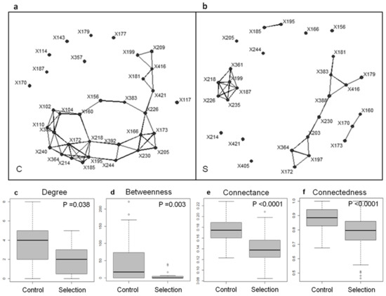 An example of a network-based analysis of microbiome selection (from [40]). The co-occurrence matrices of the T-RFLP-defined genetic units present after 21 generations were used to build interaction networks for (a) the control (C) and (b) the selection treatment for low CO2 emission (S). When two dots are connected by lines, it means that the abundances of the genetic units were significantly correlated (Spearman correlation coefficient; N = 6; p < 0.05). The interaction networks were used to calculate several network indices (c–f) as follows. The average degree (c) is the average number of interactions engaged in by one genetic unit (equal to 0 for an unconnected unit), providing an estimate of network complexity. The average betweenness (d) is the average number of shorter chains going through one node, which can signal the presence of keystone species in the network. The connectance (e) is the proportion of possible links between species that are actually realized. The connectedness (f) is the probability that at least one chain exists between any pair of units, which quantifies all the direct and indirect interactions within the network. The networks were bootstrapped (200 random samples from each group’s pool of genetic units) to determine (e) average connectance and (f) average connectedness. The values of these indices were compared for the control and selection treatment using Wilcoxon rank-sum tests (employing a continuity correction for non-parametric distributions).