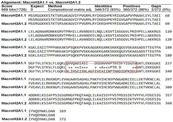 Sequence alignments of macroH2A1.1 versus macroH2A1.2 (human). Local alignment of the sequences of macroH2A1.1 and macroH2A1.2 performed with BlastP.