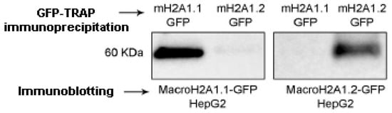 Upon immunoprecipitation of (GFP)-tagged macroH2A1.1 and macroH2A1.2 fusion proteins using GFP-Trap® Magnetic agarose kit (ChromoTek, Planegg-Martinsried, Germany), immunoblotting analyses were performed as described previously [17]. Primary antibodies were obtained from Activ Motif (Waterloo, Belgium; macroH2A1.1 and macroH2A1.2).