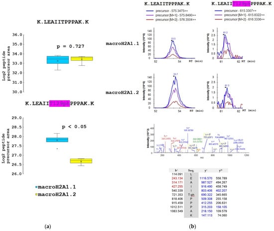 The samples for mass spectrometry analysis were enzymatically digested, either directly or after chemical derivatization of amine groups at lysine residues, to achieve higher sequence coverage of macroH2A1 isoforms (for details, see Section 2.2). Spectra of tryptic peptides obtained from both fractions were subjected to database search. The following PTMs were detected on macroH2A1 proteins with high confidence: K7ac, T129ph, S170ph, and S173ph. The merged database search results of both fractions are presented in Figure 3. Basically, the same set of PTMs was identified in both macroH2A1 isoforms. No PTM was detected within the isoform-specific region (198–229 AK). Phosphorylated peptides K.LEAIIT129phPPPAK.K and K.AAS170phADSTTEGTPADGFTVLSTK.S were identified in non-derivatized samples. The K.AASADS173phTTEGTPADGFTVLSTK.S peptide was identified only in a single replicate of macroH2A1.2; nevertheless, it documents that both S170 and S173 are phosphorylated in vivo (see the representative spectra of positional isomers in Supplementary Figure S2). While S170ph-peptide was intense enough for quantification, S173ph-counterpart could not be quantified due to a very low intensity across the sample set. Chemical derivatization enabled the identification of peptides with multiple lysines in the sequence, including R.GGK7acKKSTKTSR.S. While the levels of acetylated K7 histone marks were comparable between the two isoforms (Figure S3), significant quantitative differences were found in identified phosphorylated peptides. In particular, more than two-fold lower levels of LEAIIT129phPPPAK peptide together with a higher level of AAS170phADSTTEGTPADGFTVLSTK peptide were detected in macroH2A1.2 compared to macroH2A1.1, while the abundances of respective non-phosphorylated counterparts were comparable (Figure 4 and Figure 5).