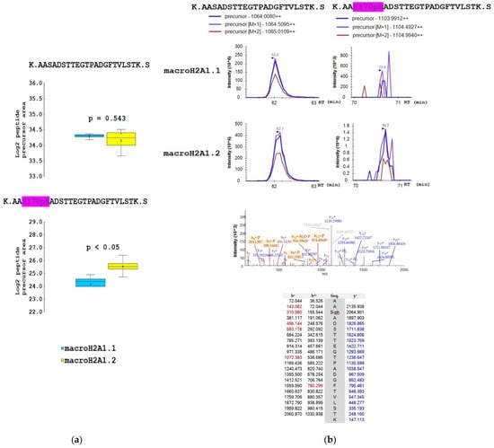 The proportion of S170ph mark on macroH2A1.1 and macroH2A1.2 protein isoforms in HepG2 cells. (a) Box-plots of the relative abundance of phosphopeptides and corresponding non-modified counterparts showing extremes, interquartile ranges, means, and medians (N = 4). Data were normalized to the sum of selected non-modified peptides to eliminate the effect of different expression levels of the two isoforms during quantitative analyses. Differences between samples in normalized peptide abundances ≥1.5-fold at p < 0.05 were considered as significant. (b) Representative MS extracted ion chromatograms of K.AASADSTTEGTPADGFTVLSTK.S with (m/z 1103.991) and without phosphorylation at S170 (m/z 1064.008), showing their abundance in macroH2A1.1 and macroH2A1.2 isoforms. Representative MS/MS spectrum produced from the precursor ion of m/z 1103.991 and fragments of y- and b-series with the m/z values are shown.