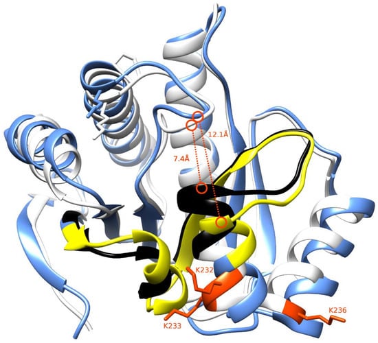 Three-dimensional structures of macroH2A1.1 and macroH2A1.2. The structures of macroH2A1.1 and macroH2A1.2 are drawn in white and light blue, respectively. The region showing sequence difference between the two proteins (198–229) has been highlighted in black for macroH2A1.1 and yellow for macroH2A1.2. The residues K232, K233, and K236 have been marked in red. The binding pocket’s width has been highlighted with a dashed red line reporting the measure in Ångstroms.