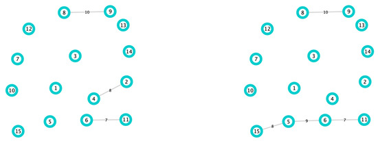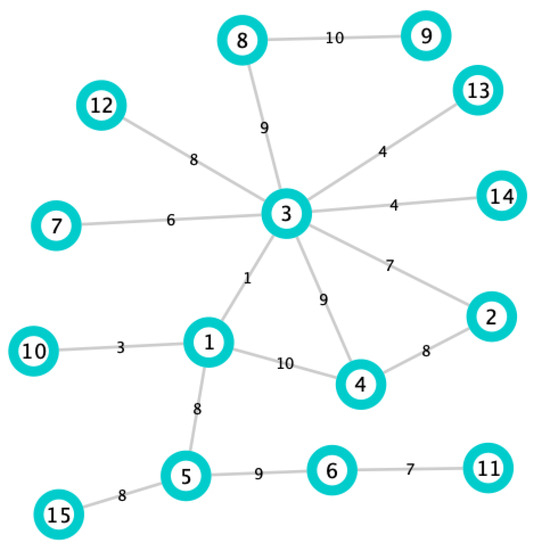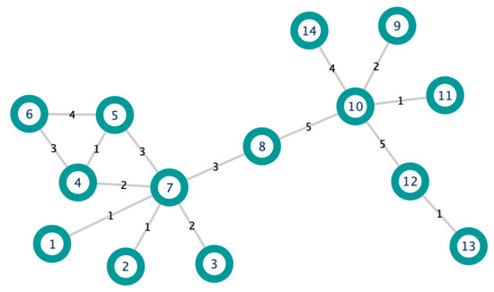 In order to illustrate the above Definition, let us consider the edge-weighted graph in Figure 1. Moreover, we consider the edges and . Notice that they both have the same weight (three). For this example, we set . Applying Definition 7, we get: