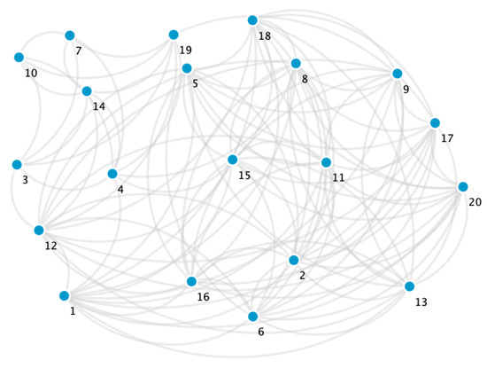 To construct the graph, we must resort to Definition 11. For instance, person 17 is related to all the people who live in city A or who work at Workplace 8 or who have music as an extra curricular activity or whose address is k. With respect to the weights of the edges, Equation (6) in Definition 14 gives us the answer. For instance, person 6 matches person 11 in the answers of the variables and , this is to say, both people live in city A and have the same workplace. Then, the edge has weight . Figure 2 shows the obtained graph.