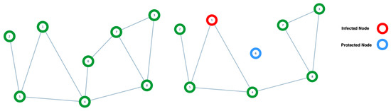 - Manríquez, R.; Guerrero-Nancuante, C.; Taramasco, C. Protection Strategy for Edge-Weighted Graphs in Disease Spread. Appl. Sci. 2021, 11, 5115. [Google Scholar] [CrossRef]