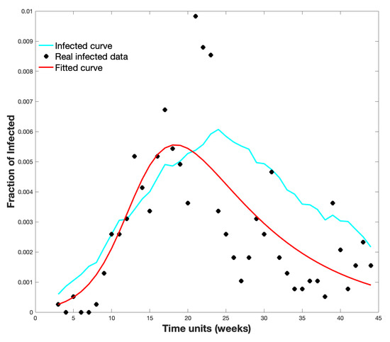 The initial population contains one infected node and all the simulations that consider . Five hundred simulations were performed on with . Figure 7 shows the average infected curve and the real infected data in . Moreover, it shows a curve fitted to the data following the SIR model; for this, we used the classic method of least squares to compare with our proposal.