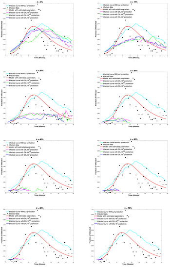 The different infected curves, considering the 10% protection according to the DIL-Wαranking and carried out in different weeks.