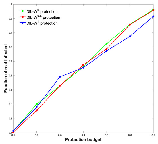 In summary, we apply the protection to the network, according to the importance ranking list produced by DIL-W, considering different protection budgets. For the ranking DIL-W, we consider three different values for ; they are 0, and 1. In this way, we compare how the protection performs according to the value of .