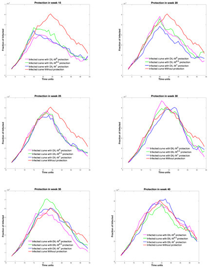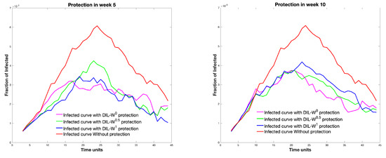 Another element that we have considered investigating is the time at which the protection takes place. We modified the protection in the graph as the weeks advanced. In Figure 11, we can see the different infected curves, considering the 10% protection according to the DIL-W ranking.
