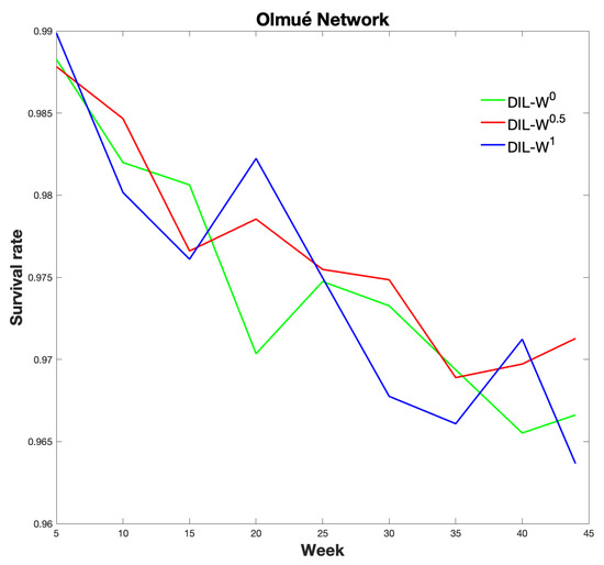 On the other hand, the level of effectiveness of the DIL-W ranking, given the percentage of protection, is established in the recognition of the bridging nodes in a regular vaccination process. The results using the parameters of DIL-W indicate a high survival rate. DIL-W achieves better results with 70% protection and is positioned with the best survival rate, but DIL-W and DIL-W show good results. The difference between the different values of is marginal and can be explained by the adequate representation that the DIL-W model has and by the values of , which do not generate excessive differences in the ranking. This is similar to the results of the research by Ophsal et al. who, through Freeman’s EIES network, mention that the centrality degree (Definition 7) is relatively stable among the different parameters [32].
