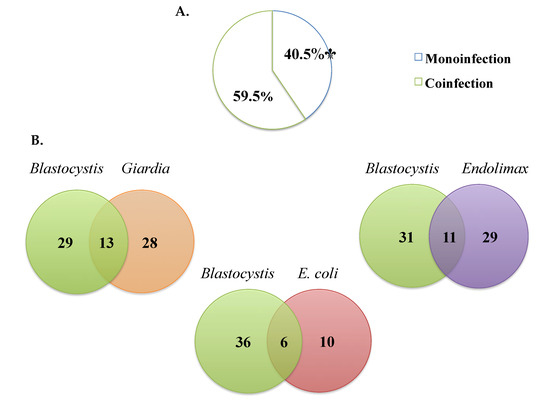 (A) Percentages of monoinfection and coinfection in samples positive for Blastocystis by microscopy. (B) The most frequent coinfections by microscopy.