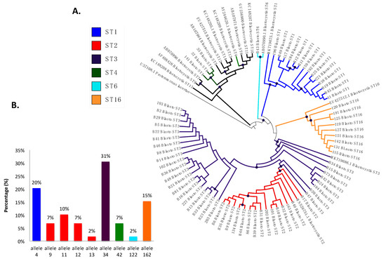 (A) Phylogenetic tree of Blastocystis subtypes detected in Medellín, Colombia. (B) Distribution of Blastocystis 18S alleles from the samples analyzed based on each subtype.