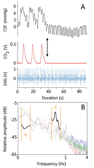 (A) For 90 s, simultaneously recorded CSF pressure (black, upper trace), exhalatory CO2 (red, middle trace), and EKG (blue, lower trace) from Candoia aspera. The left portion of the CSF trace exhibits low-frequency pulses which correspond to the ventilator cycle, and high-frequency pulses which correspond to the cardiac cycle. After three ventilator cycles, the ventilator was stopped (black arrow), forcing the snake into apnea and eliminating the low-frequency pulses from the CSF trace. (B) Power spectral analysis of four 90 s traces recorded from four different specimens of Candoia aspera. Three of the specimens (red, green, and blue traces) were ventilating at approximately the same rate and had similar heart rates. The data from the fourth specimen (black trace, highlighted for emphasis) were recorded while the specimen was in apnea; note that under apnea the power of the ventilatory component was lower while that of the cardiac component was higher. The cardiac (C) and ventilatory (V) ranges are denoted by the orange vertical lines.
