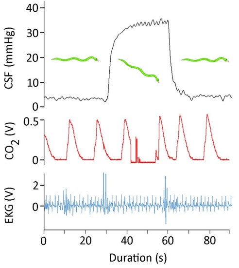The EKG traces from Candoia aspera (Figure 1A and Figure 2) are very similar to EKG traces previously published from other snakes [45,46]. The experiments with C. aspera were conducted at 29–31 °C; the mean heart rate of 40 bpm is similar to what has been reported from other species at this temperature [47]. With the terrestrial C. aspera under the influence of isoflurane, no compensatory changes in heart rate were found for head-up or head-down orthostatic gradients. Similar results have been reported from other terrestrial snakes [35]. Armelin et al. [48] noted some of the challenges in the literature of this topic, and provided a pharmacological analysis of the orthostatic response of Boa constrictor. For the present study, the important issue is that there was no apparent cardiovascular response to tilting that could have influenced the CSF pressure.