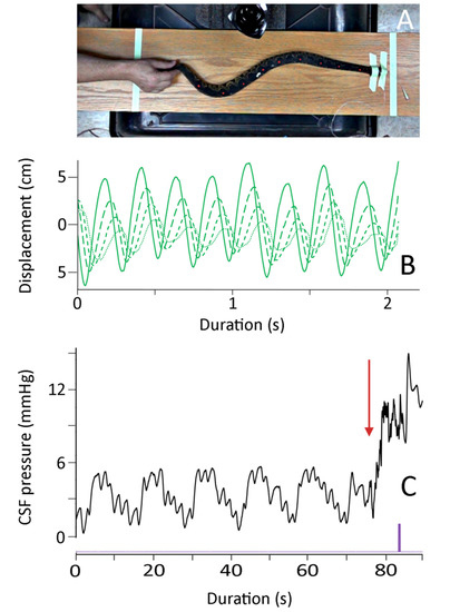In Candoia, as in all snakes, the epidural space contains vascular elements but is free of the prominent adipose tissue that characterizes this region in mammals [56]. Snakes are well-known for their vertebral flexibility, and C. aspera has a characteristic defensive behavior in which it coils its body into a tight ball [57]. The manual oscillations performed on the anesthetized C. aspera produced curved bends in the body (Figure 3), not sharp kinks; these bends had a higher radius of curvature than those formed during the snake’s natural defensive posturing. The nature of these curves, combined with the general “openness” of the epidural space in snakes, makes it difficult to attribute the changes in CSF pressure during manual oscillations to an impingement or compression of the spinal dura sheath.