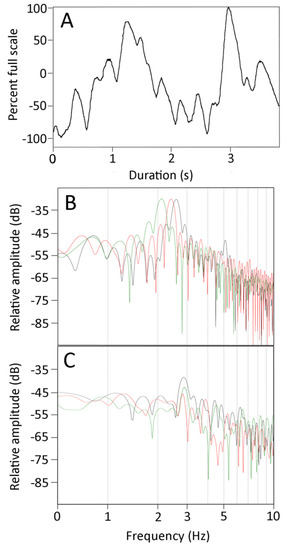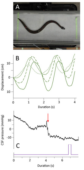 Following these axial deflection trials, the snake was allowed to fully recover from the anesthesia, with the CSF pressure catheter still in place. When the snake was fully recovered from the anesthesia (gauged by the presence of tongue flicks, avoidance response to tactile stimulation, and voluntary locomotion) the snake was placed in a 120 × 47 cm filming cage which was lined with a soft material (designed to minimize frictional contact points). Synchronized high-speed digital video and CSF pressure recordings were made while the snake was locomoting (unrestrained). All video records were exported to motion analysis software (Kinovea; open sourced from: https://www.kinovea.org/download.html, accessed on 22 May 2021), which was used to quantify the kinematics of the marker points on the snake’s body. For statistical comparison, the kinematic traces and CSF pulses were rectified and normalized. Kinematic and CSF traces were imported into Spectra-Plus (Pioneer Hill Software; Poulsbo, WA, USA) for FFT and Power Spectrum analysis.