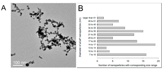TEM image of the aCaP nanoparticles used in this study (A) and size distribution (B).