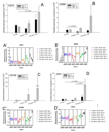 To get more insight into the individual response of each donor and to show individual comparisons at a glance (Figure 2A’–K’), we provide three tables (Table 1, Table 2 and Table 3). They denote changes determined when 5 µg/mL aCaP were compared to control (Table 1), when 50 µg/mL aCaP were compared with 5 µg/mL aCaP (Table 2) and when expression at day 14 was compared to day 7 (Table 3). Further quantitative information can be found in the Supplementary Figures S1–S6.