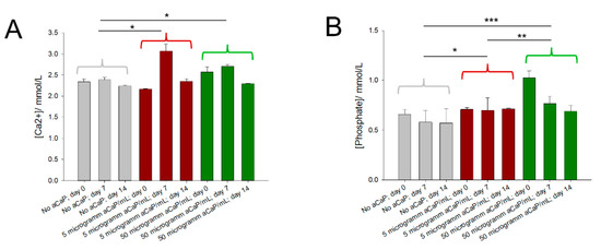 Average free calcium concentrations (A) and phosphate concentrations (B) for three conditions and two three points, with 0, 5, or 50 µg/mL aCaP nanoparticles and initially, as well as 7 or 14 days in culture, respectively. Two-way ANOVA for Ca2+ revealed significant differences between day 0 and day 7 (p = 0.0003), day 7 and day 14 (p = 0.0001), 0 and 5 µg/mL aCaP (p = 0.0113, marked with *), as well as 0 and 50 µg/mL aCaP (p = 0.0132, marked with *). Two-way ANOVA for phosphate revealed significant differences between day 0 and day 7 (p = 0.0323), day 0 and day 14 (p = 0.0027), 0 and 5 µg/mL aCaP (p = 0.0300, marked with *), 0 and 50 µg/mL aCaP (p < 0.0001, marked with ***), as well as 5 and 50 µg/mL aCaP (p = 0.0100, marked with **). Error bars indicate standard deviations.