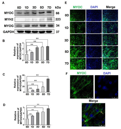 3.1. Expression Pattern and Localization of MYOC during the Differentiation of C2C12 Cells