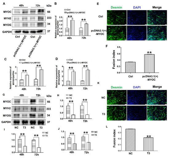 To determine the effect of MYOC on the differentiation of C2C12 cells, pcDNA3.1(+)-MYOC was transfected into C2C12 cells using polyethylenimine (PEI; Sigma, Aldrich, St. Louis, MO, USA). The C2C12 cells were induced to differentiate for 48 h and 72 h. Western blotting indicated that MYOC expression levels increased significantly (Figure 2A,B). Additionally, higher levels of MYH2 and MYOG were expressed after upregulation of MYOC (Figure 2A,C,D). The rate of C2C12 myotube fusion increased from 33.24% to 58.28% (Figure 2E,F). Moreover, after transfection of T3 into the C2C12 cells and differentiated for 48 h and 72 h, the expression levels of MYH2 and MYOG decreased after MYOC expression was silenced (Figure 2G–J), with myotubule fusion rate decreasing from 36.29% to 21.15% (Figure 2K,L). These results indicate that MYOC influenced the differentiation of C2C12 cells.