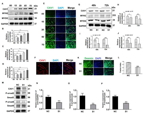 To further explore the influence of CAV1 on the differentiation of C2C12 cells, S1 was transfected into C2C12 cells, after which protein samples were collected. The results indicate that when CAV1 expression was inhibited, protein expression levels of MYH2 and MYOG also decreased (Figure 4G–J), as did the rate of fusion of myotubes, decreasing by 21.48% compared with the control group (Figure 4K,L). As demonstrated in previous reports, we demonstrated that CAV1 promoted the differentiation of C2C12 cells [25]. To confirm the relationship between CAV1 and the TGF-β pathway, the phosphorylation levels of Smad2 and Smad4 were measured after decreased CAV1 expression. The results showed that P-Smad2 and P-smad4 expression decreased, establishing that TGF-β activity was inhibited (Figure 4M–P). These results demonstrate that CAV1 was able to regulate the differentiation of C2C12 cells via the TGF-β pathway.