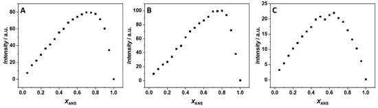 Job’s plot for ANS/BSA complex formation obtained at the temperature of 25 °C and pressure of 1 bar in the presence of 250 mM (A) MgCl2, (B) MgSO4, and (C) Mg(ClO4)2. The total concentration ([ANS] + [BSA]) was 35 µM. The fluorescence intensity is reported in arbitrary units (a.u.).