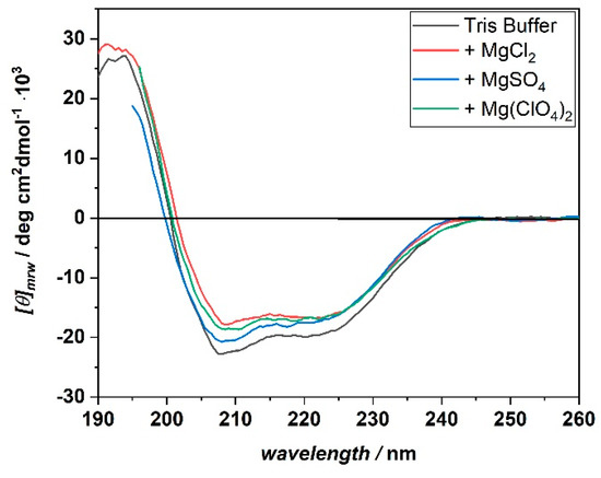 Principally, the differences observed for the effect of temperature and salt on complex formation could be ascribed to conformational changes of the protein structure. To test this possibility, circular dichroism (CD) spectra of BSA in the far-UV range were recorded. In this spectral region, information about the secondary structure of the protein can be obtained [22,23]. The spectra were acquired at temperatures of 5, 15, and 25 °C, and in the presence of the three different salts. Figure 3 shows the CD spectra of BSA recorded at 25 °C in the presence of 250 mM MgCl2, Mg(ClO4)2, and MgSO4. For reference, the CD spectrum of BSA in neat buffer (10 mM Tris-HCl, pH 7.4) is also shown.