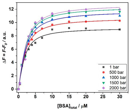 Binding isotherms for ANS/BSA complex formation obtained at T = 25 °C in the presence of 250 mM MgCl2, at the indicated pressure values. The solid lines represent the best fit of experimental data according to an equivalent and independent binding sites model. All the experiments were performed in 10 mM Tris-HCl buffer. The binding isotherms were obtained by plotting ΔF = F − F0 (where F is the fluorescence intensity of ANS at the maximum in the presence of BSA, and F0 is the intensity of ANS in the absence of BSA) as a function of the total BSA concentration.