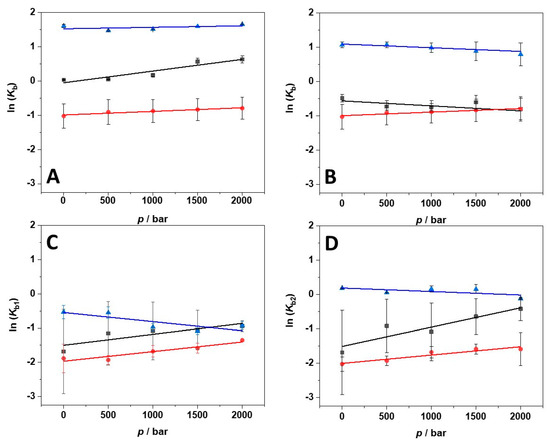 Pressure dependence of the binding constant (Kb) for the complex formation between BSA and ANS in the presence of 250 mM MgCl2 (A), MgSO4 (B), and Mg(ClO4)2 (C) and (D) at the temperatures of 5 °C (black squares), 15 °C (red circles), and 25 °C (blue triangles). The plot in (C) refers to the pressure dependence of the binding constant of the first binding site (Kb1), the plot in (D) to that of the second binding site (Kb2). From the slopes of ln(Kb) vs. p, the binding volume (ΔVb) can be calculated by means of Equation (1).