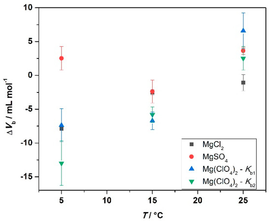 At T = 25 °C, the binding volume in the presence of MgCl2 is close to zero, highlighting the negligible effect of pressure on the complex formation. Instead, in the sulfate-containing solution, the volume change is slightly positive, i.e., the application of pressure does not favor the interaction between the protein and the ligand. In the presence of perchlorate, the binding volumes of both binding sites are positive. However, ΔVb1 > ΔVb2, indicating that the two binding sites are characterized by different packing and hydration properties. In the presence of MgCl2, the decrease of temperature is accompanied by more negative ΔVb values; this is to say, decreasing temperature and increasing pressure both favor the complex formation. Instead, in the MgSO4-containing buffer, ΔVb-changes with temperature are less pronounced. A small decrease of ΔVb was observed, only. Interestingly, in the presence of Mg(ClO4)2, the temperature had a comparably strong impact on the volume changes. Both binding volumes become negative, reaching values of −7.4 and −12.9 mL mol−1 for the first and the second binding site, respectively. Thus, when magnesium perchlorate is present in solution, the combined increase of pressure and decrease of temperature strongly favor the complex formation. To highlight the changes of binding volume with temperature, ΔVb (T) is shown for the different salts in Figure 6.