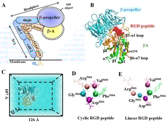 Two simulated systems of integrin αvβ3 binding with cyclic or linear RGD were set up for the MD simulations (Figure 1). The simulation for the cyclic system was started from the crystal structure 1L5G (resolution: 3.20 Å) containing the complex of integrin αvβ3 headpiece with the cyclic RGD peptide []. The linear MD system was then obtained from the same crystal structure but only the RGD sequence was linearized (Figure 1D,E). To reduce the system size, we only used the headpiece of integrin αvβ3, including the βA domain of the β3 subunit (residues 110 to 353) and the β-propeller domain of the αv subunit (residues 1 to 438) (Figure 1A,B). Before MD simulations, the complex was solvated in a 126 × 107 × 81 Å3 water box together with Na+ and Cl− ions to neutralize the system at a 150 mM ionic concentration, resulting in 104,246 atoms (Figure 1C). Due to the lack of Mn2+ force field parameters, a universal method in which Mn2+ is replaced by Mg2+, metal ion-binding sites were occupied by Mg2+ ions in the integrin αvβ3 headpiece in our simulations.