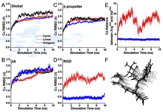 The simulation time curves of RMSD for RGD liganded integrin αvβ3 during equilibration for the global systems (A), the β-propeller regions (residues 1–438) (B), the βA regions (residues 110–353) (C), and the RGD peptide segments (D). Each time–RMSD profiles was averaged from three independent runs. The unliganded αvβ3 integrin regions are shown in black, the cyclic RGD and its complex with integrin αvβ3 are shown in blue, and the linear RGD and its complex with integrin αvβ3 are shown in red. (E) Time series of the Cβ-atom distance between ArgRGD and ValRGD. (F) The trajectory of the linear RGD ligand as time changed from dark to light grey. Image of all 50 frames shown at once, smoothed with a 100-frame window.
