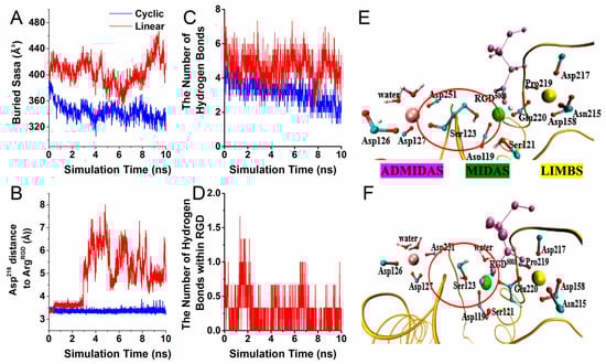 The buried solvent accessible surface area and the major interactions during equilibration. Each curve presented an average of data from three independent runs. (A) The buried solvent accessible surface area (SASA) during equilibration. (B) The distance between Asp218 and ArgRGD, (C) Time series of the number of hydrogen bonds for receptor–ligand interaction. (D) Time series of the number of hydrogen bonds for the RGD interactions. (E,F) Coordination spheres of the three important metal ions in the (E) cyclic RGD liganded system and (F) linear RGD liganded system. Atoms are shown with a CPK representation (carbon atoms are cyan, oxygen atoms are red, and hydrogen atoms are white), and a portion of integrin is shown as a yellow ribbon. The ADMIDAS (purple), MIDAS (green), and LIMBS (yellow) ions are shown in a VDW representation.