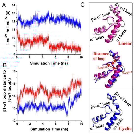 We further analyzed the dynamic trajectories during equilibration to estimate whether the different conformational features of the ligand caused a local structural change in integrin αvβ3. Vogel et al. reported that ligand binding could induce the activating integrin αvβ3 conformational change via the formation of the T-junction between the middle of the α1 helix and the top of the α7 helix []. Similarly, we measured the distance between Leu134 of the α1 helix and Leu333 on the β6 strand to identify the formation of T-junctions. This distance is shown in Figure 4A. The comparison between the linear and cyclic RGD revealed that there was a considerable decrease in distance in the linear RGD, whereas the cyclic RGD remained nearly identical throughout the simulation time. Corresponding to a decrease in the Cβ-atom distance, the bidirectional allosteric signal process was accompanied by an increase in distance between the β1 and α1 and β6–α7 loops. A similar increase in the separation between the β1–α1 and β6–α7 loops was observed in both systems. However, the increase in distance in the linear region was obvious (Figure 4B).