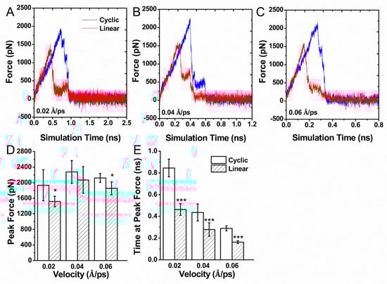 Force-induced dissociation of linear vs. cyclic RGD from integrin αvβ3 by steered molecular dynamics. The force profiles were obtained from five independent simulations of pulling the ligand away from integrin αvβ3 by pulling speed v = 0.02 Å⋅ps−1 (A), v = 0.04 Å⋅ps−1 (B), and v = 0.06 Å⋅ps−1 (C). Average peak force (D) and average time required to reach peak force (E) are indicated. Error bars: standard deviation from the mean; asterisks: statistical significance following the t-test (* p < 0.05; *** p < 0.01).