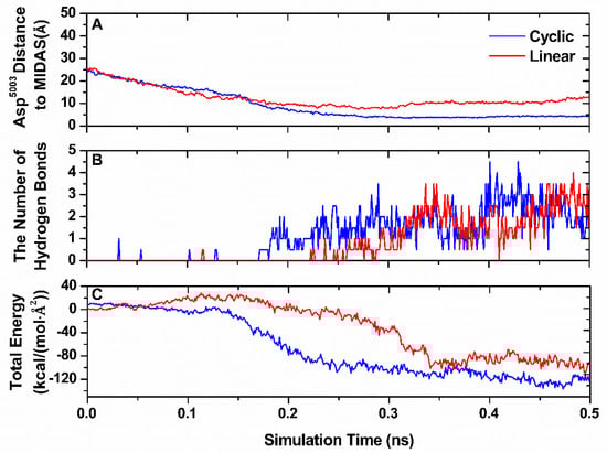 The interaction features were examined to assess the behavior of the binding process (Figure 7). Compared with the cyclic RGDfV, the distance between the side-chain oxygen atom OD2 of AspRGD and the headpiece of integrin αvβ3, which was the most vital bond in the complex, was larger in the linear system (Figure 7A), implying that the interaction was much weaker for the linear system. The formation of hydrogen bonds occurred continuously while moving along the binding site (Figure 7B). The final number of hydrogen bonds was greater than that of cyclic RGD. The more hydrogen bonds, the stronger the binding forces. The linear RGD peptide may have arrived at its binding site slowly. The interaction energy profile during the binding process is shown in Figure 7C. The energies increased along both RGD peptides, pushing into the active binding site. The lowest valley was produced in the cyclic RGD system. The corresponding time was also much shorter. The results indicate that it was easier for the cyclic RGD-containing peptide to bind to the active site than the linear RGD peptides.