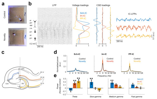 Activity of the pathway-specific LFPs during familiar vs. novelty explorations. (a) Example of one video frame acquired during the exploration of familiar (top) and novel (bottom) environments. (b) Decomposition of the hippocampal LFPs in their sources using ICA. Left: LFP traces recorded along the dorsal hippocampus (or, stratum oriens; pyr, pyramidal layer; rad, stratum radiatum; lm, stratum lacunosum-moleculare; gc, granule cell layer; hil, hilus.). Middle: Voltage and current source density (CSD) loadings of the independent components (IC) of the LFP (IC-LFPs), which represent the contribution of the sources to each LFP channel. Note that one LFP channel may be contributed by several sources. Right: IC-LFPs obtained for the represented LFPs. (c) Scheme of the main hippocampal regions. The dashed line represents the location of the electrode. Color lines identify the pathways associated to the IC-LFPs: Schaffer collateral in blue, temporoammonic pathway (EC-III efferences to CA1) in red and perforant pathway (EC-II efferences to DG) in yellow. (d) Averaged power spectrum across subjects (n = 5) for each signal in control (black) and novelty (color; mean ± s.e.m.). (e) Difference between the power in novelty versus control at different frequency bands (mean across subjects ± s.e.m.; ** p < 0.01, n = 5).