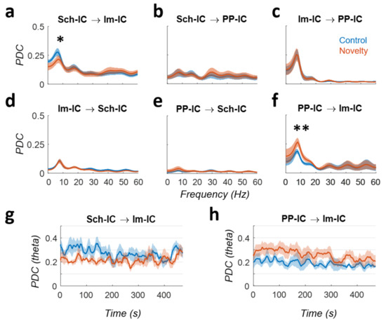 Directed functional connectivity. (a–f): PDC analysis between IC-LFPs in control (blue) vs. novelty (red) conditions for each pair of IC-LFPs and in both directions (mean across subjects ± s.e.m.; * p < 0.05, ** p < 0.01, n = 5). Arrows indicate the directionality of the interaction. (g,h): Time evolution of the PDC at theta frequency during the tasks for the two pairs of IC-LFPs showing significant differences in panels (a,h).